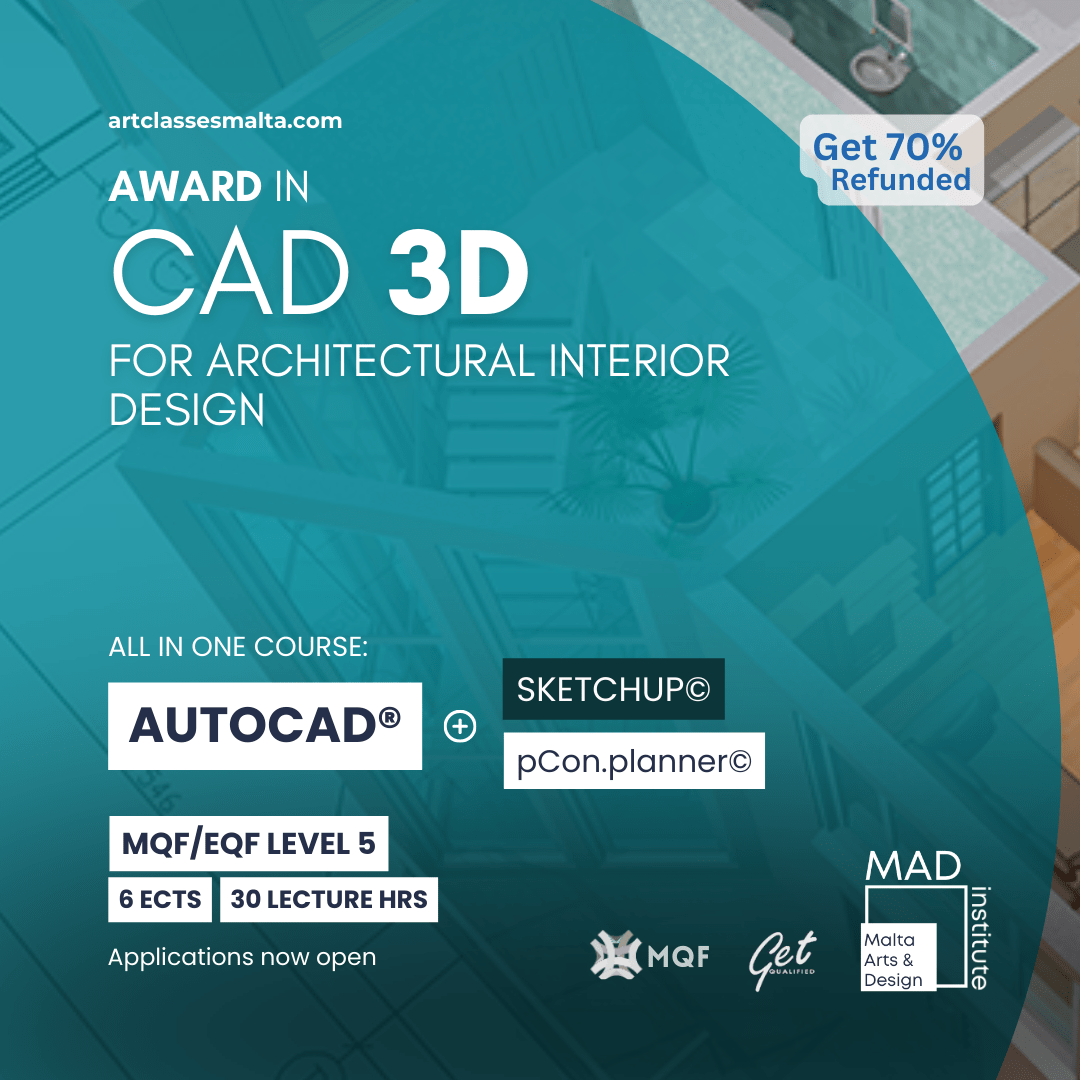 Students following the ‘Award MQF level 5 in 2D CAD for Interior Design’ study programme can apply for the Get Qualified Scheme which will enable them to benefit from a tax credit of 70% of the costs incurred (ie. €276.50 will be refunded back for this course).