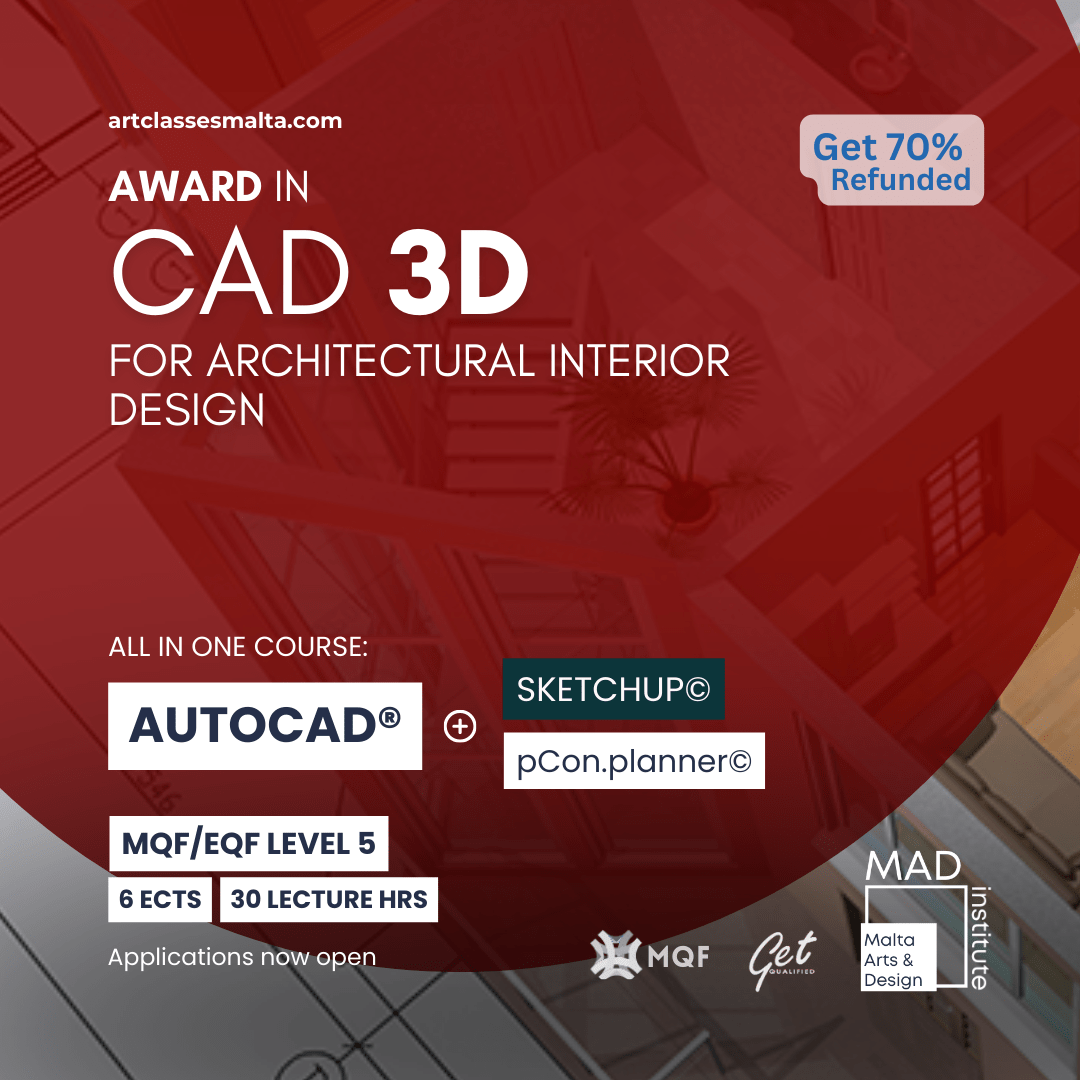 Students following the ‘Award in 3D CAD for Architectural Interior Design’ study programme can apply for the Get Qualified Scheme which will enable them to benefit from a tax rebate of 70% of the costs incurred!